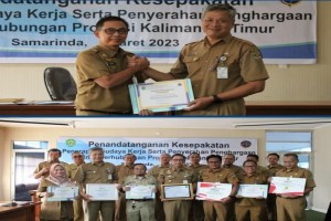 POJOKALTIM.CO.ID, SAMARINDA - Dinas Perhubungan Provinsi Kaltim melaksanakan penandatanganan kesepakatan penerapan budaya kerja sekaligus penyerahan penghargaan kepada Pegawai Dinas Perhubungan Provinsi Kaltim yang bertempat di ruang rapat lantai 2 Dinas Perhubungan Provinsi Kaltim pada Selasa (14/03/23).