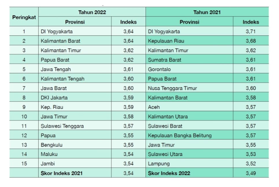"Pada tahun 2020 Indonesia hanya memperoleh skor 3,46 poin. Kemudian tahun 2021 naik menjadi 3,49 poin, naik 0,03 poin. Tahun ini, Indonesia berhasil naik 0,05 poin dari 3,49 menjadi 3,54 poin," ucap Dirjen Aplikasi Informatika Kominfo RI, Semuel Abrijani Pangerapan.