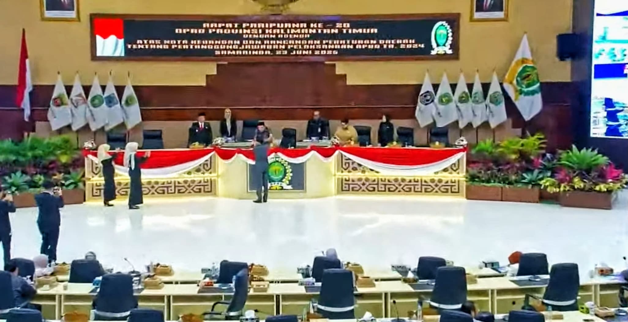 Rapat tersebut dipimpin oleh Ketua DPRD Kaltim, Hasanuddin Mas'ud. Didampingi Wakil Ketua DPRD Kaltim, Ananda Emira Moeis dan Yenni Eviliana. Hadir pula Wakil Gubernur Kaltim, Seno Aji, serta Sekretaris Dewan, Norhayati Usman. Sebanyak 35 anggota dewan turut mengikuti jalannya sidang.