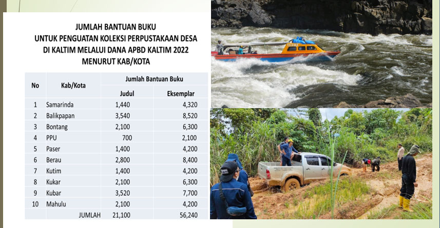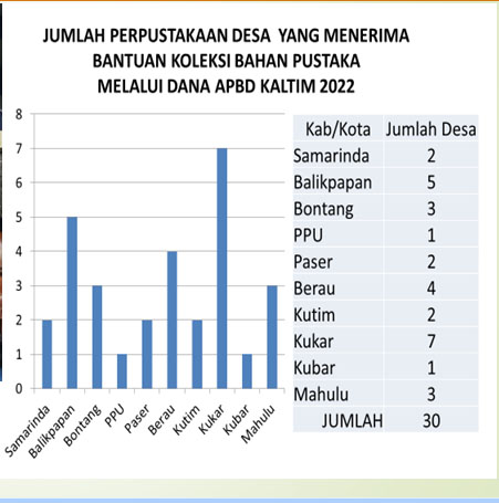 Tahun 2022 melalui APBD Kaltim, Dinas Perpustakaan dan Kearsipan Kaltim memberikan bantuan buku ke 30 Perpustakaan Desa/Kelurahan tersebar di 10 kabupaten/kota se-Kaltim. Jumlah bantuan buku yang diberikan sebanyak 21.100 judul dengan jumlah eksemplar sebanyak 56.240.
