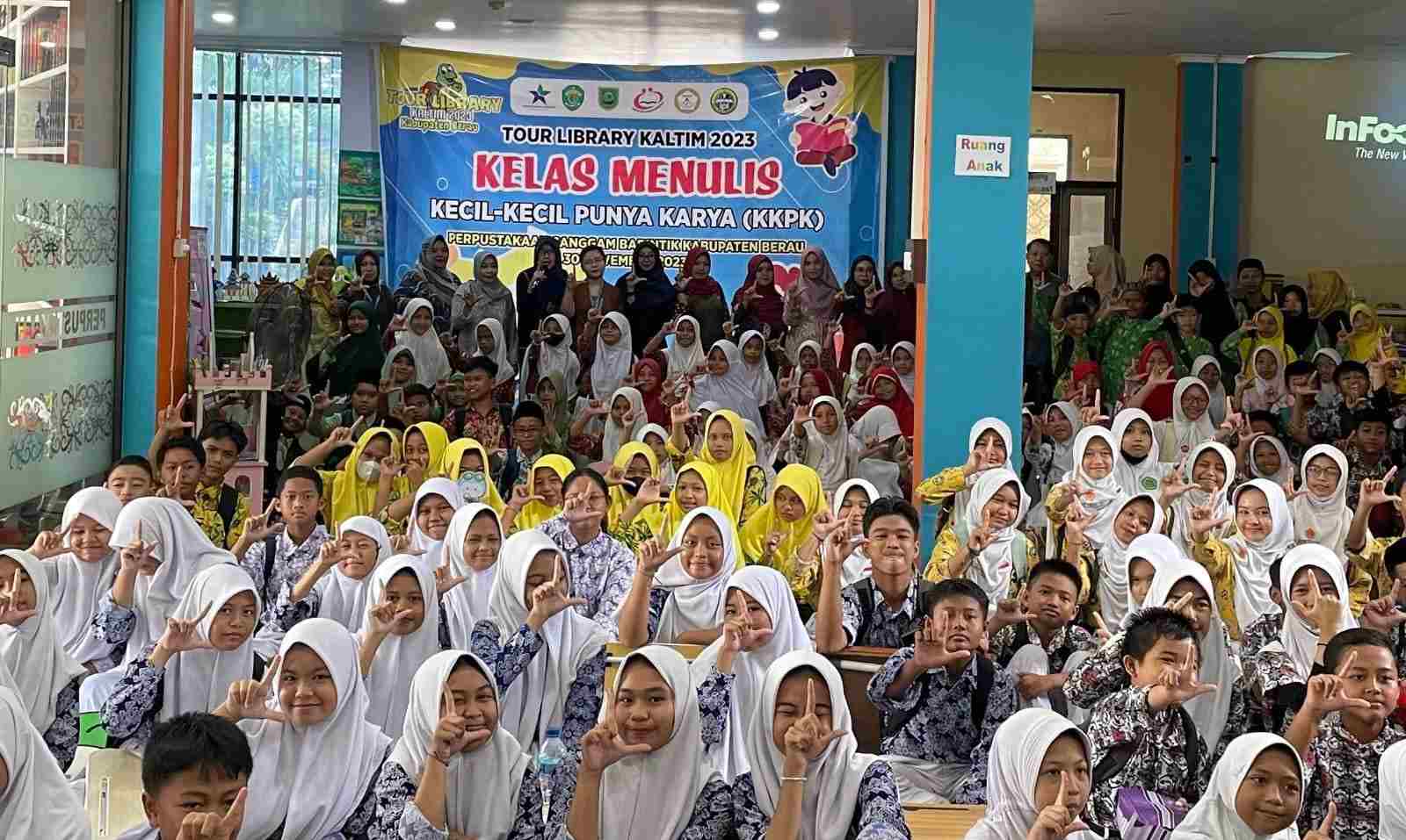 POJOKALTIM, BERAU - Kelas Menulis Kecil-Kecil Punya Karya yang merupakan salah satu agenda Tour Library 2023 Dinas Perpustakaan dan Kearsipan (DPK) Kaltim ramai peserta. Kali ini, kegiatan berlangsung di Berau. Seratusan pelajar SD-SMP di Tanjung Redeb antusias mengikutinya. Kegiatan bertempat kantor Dispusip Berau, Kamis 30 November 2023.
