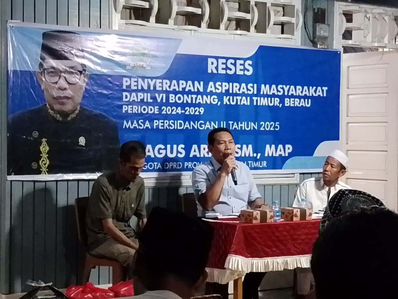 KUTAI TIMUR - Anggota DPRD Kalimantan Timur, Agus Aras, menyerap langsung aspirasi masyarakat dalam kegiatan reses Masa Sidang II Tahun 2025 di Jalan Dayung II, Kelurahan Teluk Lingga, Kecamatan Sangatta Utara, Kabupaten Kutai Timur, Sabtu malam (5/7/2025).