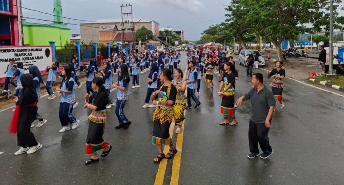 TANJUNG SELOR - Aksi tari pelajar SMP 3 Tanjung Selor menyemarakkan Gelaran Tebu Kayan. Event inisiasi Pemerintah Kabupaten Bulungan ini dilaksanakan Minggu 3 November 2024. Sekira 70 orang peserta didik yang diikutsertakan dalam tampilan kesenian tersebut dan juga didampingi oleh sejumlah tenaga pengajar.