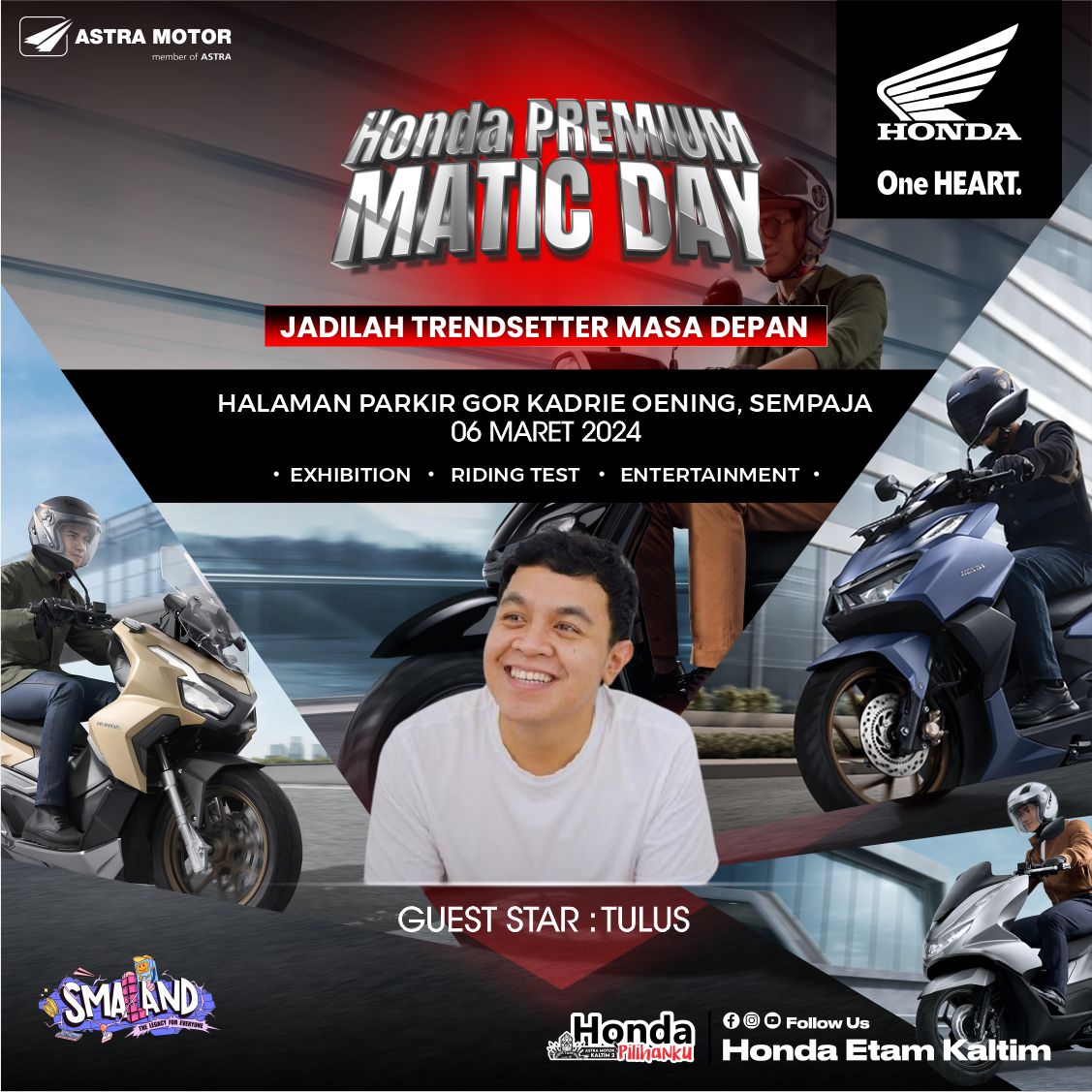 Tak ketinggalan, rangkaian aktivitas menarik seperti Exibition Matic Premium, Special Sales Program, Test Ride hingga Special Performance dari bintang tamu Ibukota yakni Tulus siap ramaikan event spesial ini.