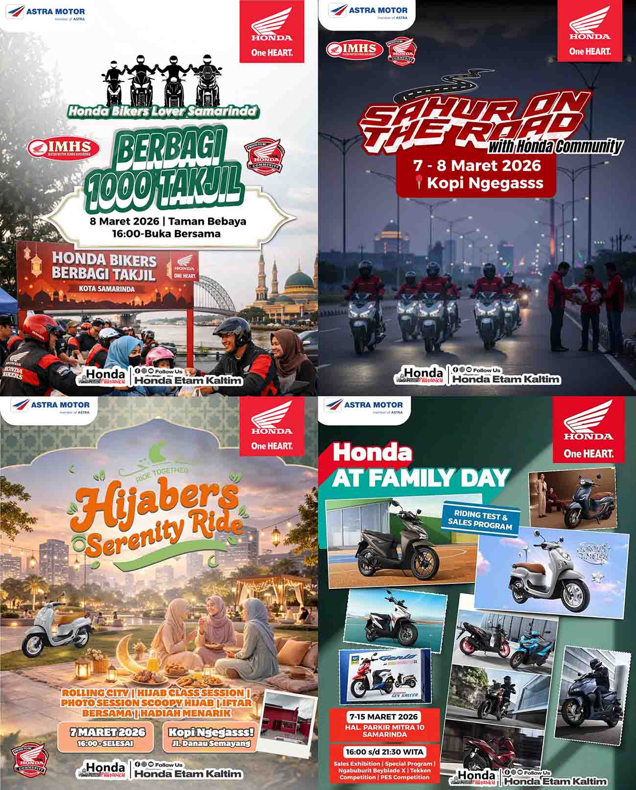 Hadir dengan semangat Satukan langkah, tebarkan kebaikan di setiap perjalanan, Sahur On The Road with Honda Community siap mengawali rangkaian kegiatan pada Sabtu (07/03) besok sebagai kegiatan pembuka di Kopi Ngegass Samarinda. Menjelang berbuka, kegiatan Hijabers Serenity Ride dan Scoopy Loopy akan hadir dilokasi yang sama khusus bagi pengendara sepeda motor wanita dengan ragam kegiatan menarik yang disiapkan seperti rolling city, hijab class session, photo session scoopy hijab hingga buka puasa bersama.