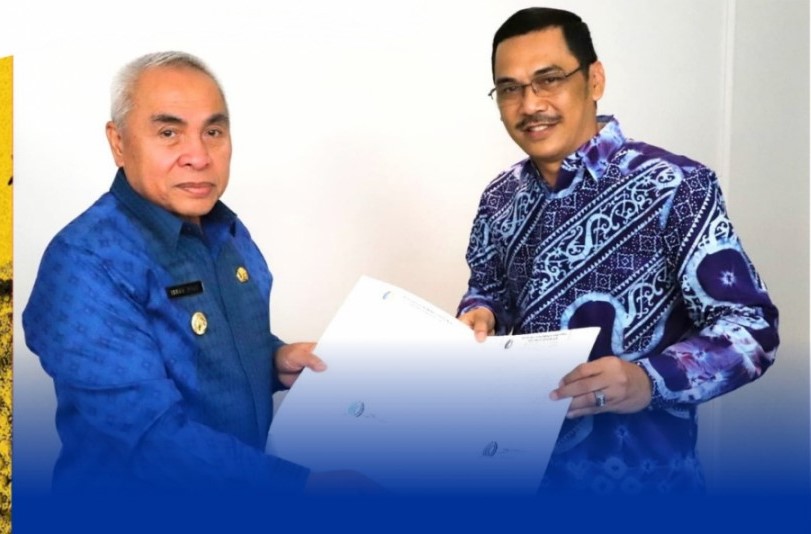 SERAHKAN: Kadiskominfo Provinsi Kaltim yang juga merupakan Wakil Ketua 1 ASKOMPSI, Muhammad Faisal (kanan) saat menyerahkan surat usulan mengenai DBH Frekuensi dari ASKOMPSI kepada Gubernur Kaltim dan juga Ketua Umum APPSI.