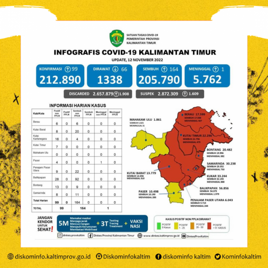 Secara akumulasi positif di Kaltim berjumlah 212.890 kasus, sembuh 205.790 kasus dan meninggal dunia 5.762 kasus.