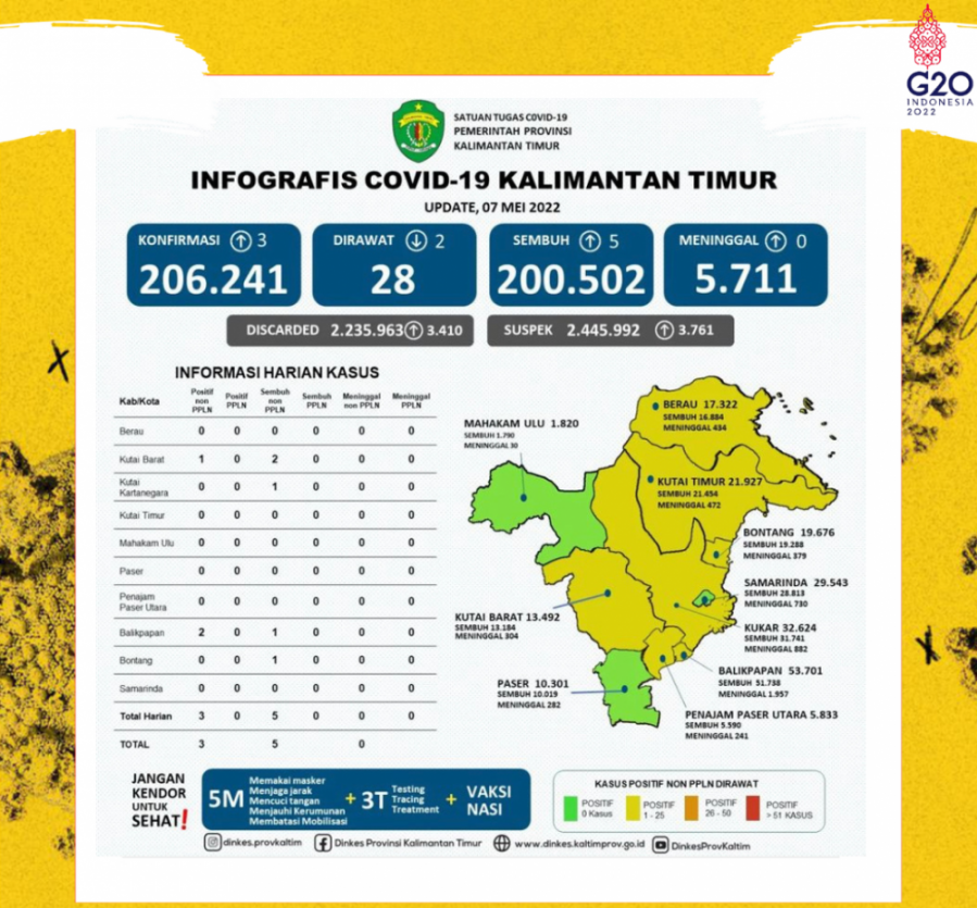 Juru Bicara Gugus Tugas Percepatan Penanganan Covid-19 Kaltim, Andi Muhammad Ishak menyebutkan per 7 Mei 2022 kasus positif bertambah 3 kasus.