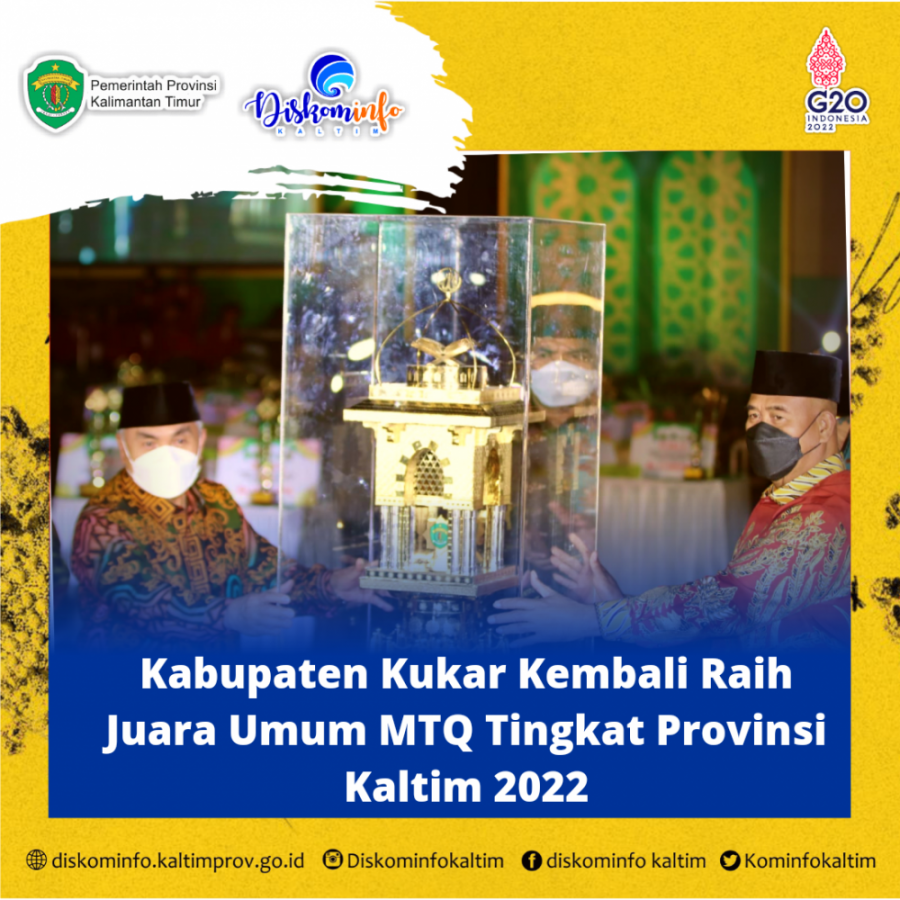 Seremoni penyerahan piala MTQ oleh Gubernur Prov.Kaltim Isran Noor ke Bupati Kukar Edi Damanyah menjadi tanda berakhirnya gelaran MTQ Ke 43 tingkat Prov.Kaltim di Kota Samarinda 2022, dan selanjutnya Kota Balikpapan yang akan menjadi tuan rumah MTQ ke 44 tingkat Prov.Kaltim 2023 mendatang. (adv/kominfo)