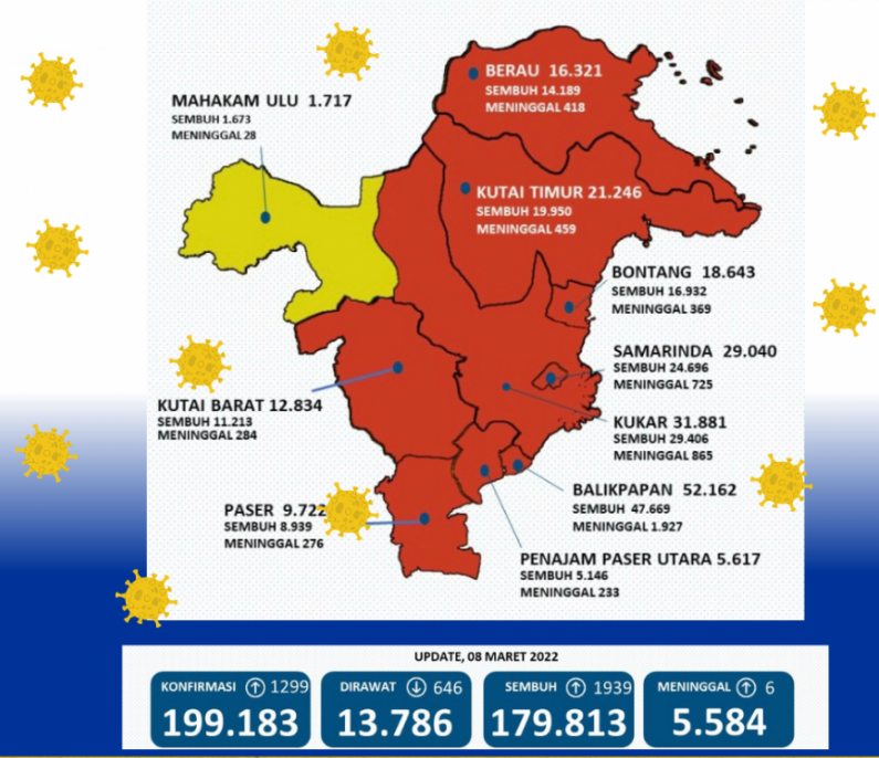 Berdasarkan rilis yang dikeluarkan Dinas Kesehatan Prov Kaltim, kasus positif per Selasa 8 Maret 2022 tercatat 1.299 kasus. Sementara Mahakam Ulu hari ini tercatat ada 5 kasus baru.