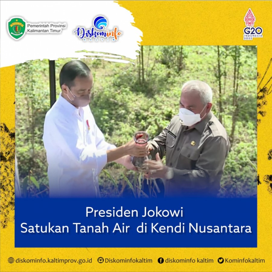 Tampak mendampingi Presiden Joko Widodo untuk menuangkan tanah dan air adalah Gubernur Kaltim, Isran Noor dan Ketua MPR RI, Bambang Soesatyo.